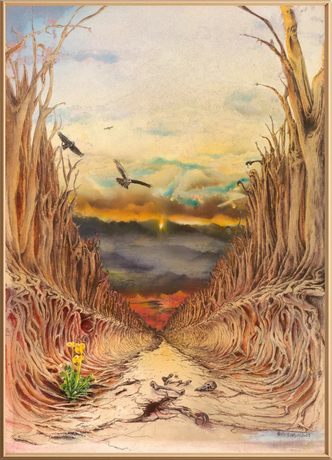 Each painting is a window into a journey—a story told not just in watercolour and ink, but in memory, emotion, and meaning. Whether through landscapes of the soul, hidden symbols, or quiet details drawn from nature and family, we invite you to carry something of this experience with you.